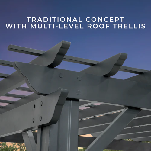 Traditional and timeless, the Stratford Steel Pergola by Backyard Discovery brings effortless charm to your outdoor living area. This stunning patio pergola combines enduring craftsmanship with modern sophistication, featuring a stylish black finish that creates a bold, striking aesthetic. Engineered with powder-coated galvanized steel, it delivers maintenance-free durability while providing superior protection against rust, chipping, corrosion, and UV damage. The elegant design provides plenty of shade with the integrated pergola canopy. This soft shade sail filters sunlight while offering protection from the elements, creating the ideal balance of shelter and ambiance. Pro-Tect™ tested and proven to withstand winds up to 100 mph*, this outdoor metal pergola stands strong through adverse weather conditions. Its generous size provides plenty of room for furniture, fire pits, and outdoor décor to create the perfect space for gatherings or simply relaxing. The patented PowerPort™ features three electrical outlets and three USB ports, making it easy to power your outdoor entertainment needs. This ready-to-assemble backyard pergola kit offers step-by-step guidance with the BILT® app, for easier installation. Backed by a 5-year warranty, the Stratford Pergola outperforms traditional aluminum and vinyl alternatives, delivering superior strength and style that will enhance your outdoor living for years to come.