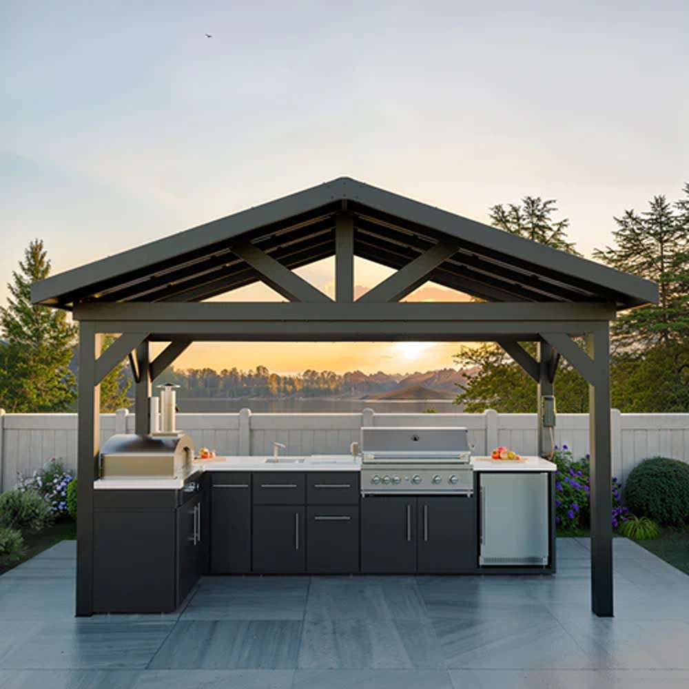 Upgrade your outdoor living with the all-weather Lancaster L-Shape Outdoor Kitchen from Backyard Discovery. Crafted from powder-coated galvanized steel and featuring a full-coverage peak roof and convenient L-shaped cabinet design, this stylish kitchen lets you enjoy outdoor cooking throughout every season while providing lasting protection against rust and corrosion. The stainless steel grill features heavy-duty grates, a warming rack, flame tamers, searing burner, and infrared rotisserie for the perfect BBQ. Experience authentic flavors with the premium stainless steel pizza oven, featuring fire brick construction and ample space for two pizzas simultaneously. Keep beverages perfectly chilled with the outdoor-rated refrigerator, featuring LED lighting and spacious three-layer storage. The elegant white marble countertops provide a generous food prep area, plus a built-in stowaway sink with removable cover for more usable space. Integrated soft-close cabinets and drawers provide sleek organized storage, while the discreet trash bin maintains sophisticated style. Pro-Tect™ tested and proven to withstand up to 5,500 pounds of roof weight and 100 mph winds*, the Lancaster delivers lasting durability. Plus, the PowerPort™ features three electrical outlets and USB ports for seamless outdoor entertaining. With a ready-to-assemble design and guided instructions through the BILT® app, you’ll be cooking outdoors in no time.